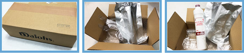 楽水が管理している、お客様の交換が必要なカートリッジが、ウォーターサーバーメーカー「ダイオーズ」から直接ゆうパックにて配送されます。